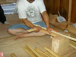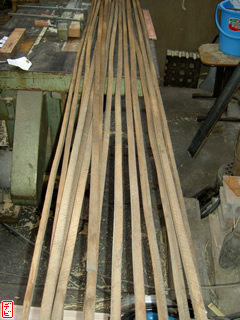 刃物や鉋で側木側を削り、成形します。「荒村(あらむら)・新村(にいむら)」と言います。その後、数千本射込み、調整のために「小村(こむら)」「射手村(いてむら)」と続きます。