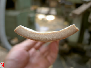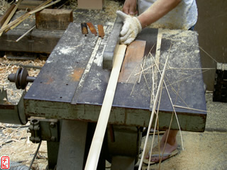 側木には櫨(ハゼ)を用います。物によっては「縄目」などの杢がみられます。側木を適切な厚みに切りそろえます。【写真3-1, 2, 3】