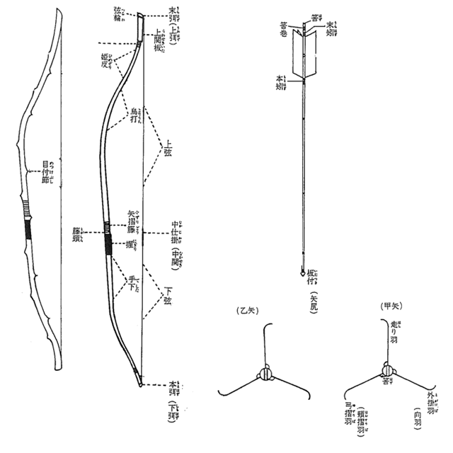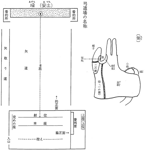 板付, 射付節, 本矧, 筈, 走り羽, 虎口, 天紋筋, 角見, 本弭, ユガケ, 勝手, 押手, 中仕掛, 弓ハ, 道宝, 蹲踞, 跪座, 脇正面, 甲矢, 乙矢